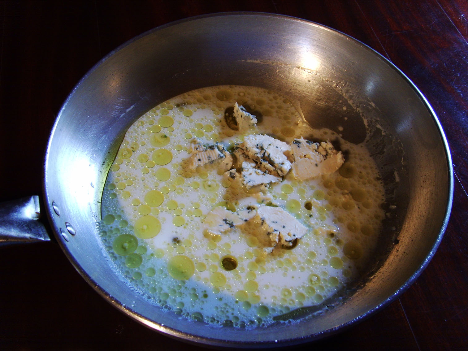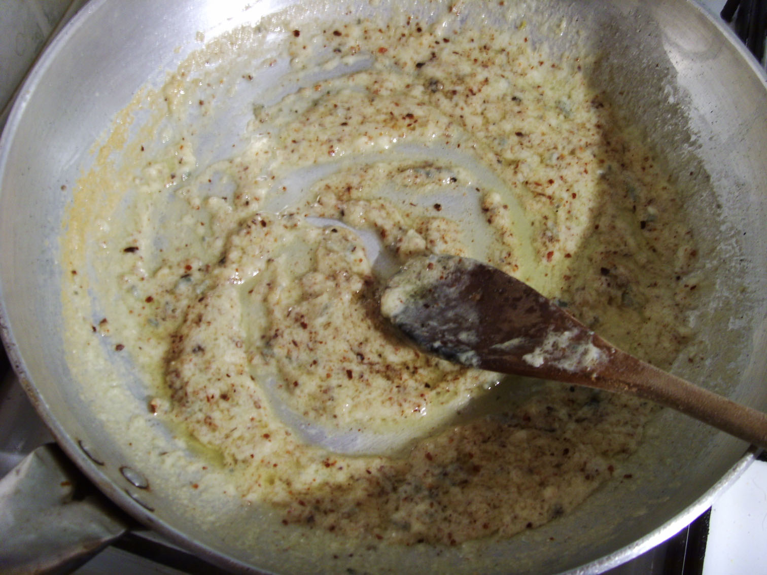 Aggiungere dei tocchetti di gorgonzola e mezzo bicchiere di latte! Mescolare fino a sciogliere il gorgonzola del tutto e aggiungere il pesto e continuare a mescolare!