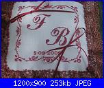 dato il poco tempo che hai, io ricamerei le due colombe con le fedi che ti posto in alto al centro poi scriverei i nomi degli sposi e in un'altra riga 50 anni insieme. Ai lati delle colombe scriverei 5. 11 . 1959 e 5. 11. 2009