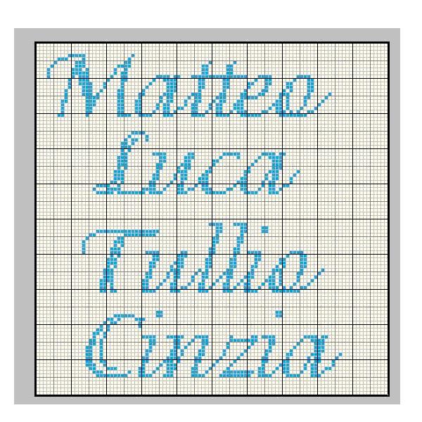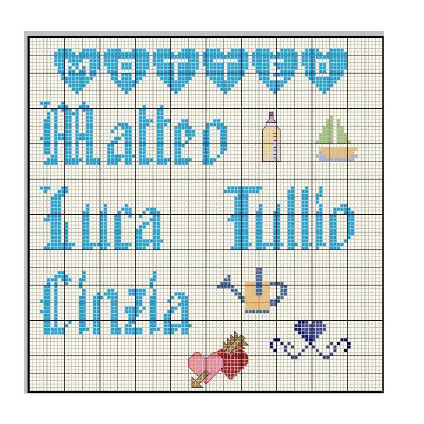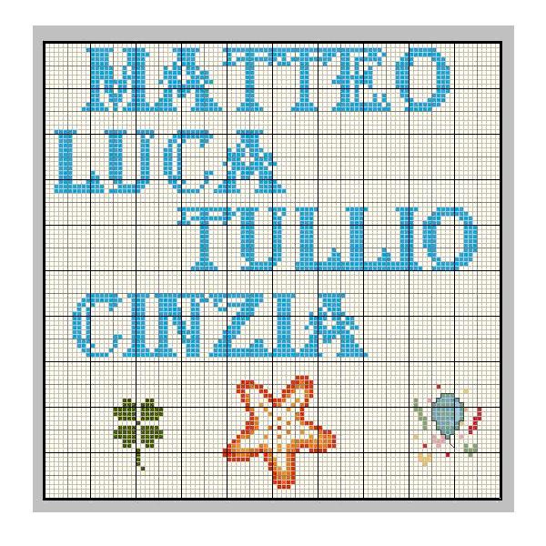 Schemi punto a croce di nomi, richiestici dai nostri utenti: Matteo, Cinzia, Tullio e Luca.