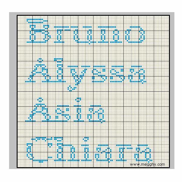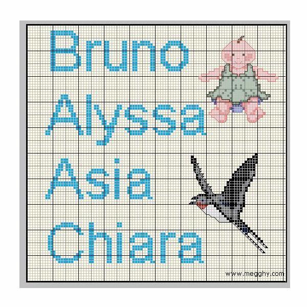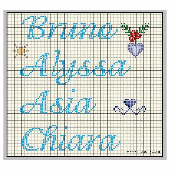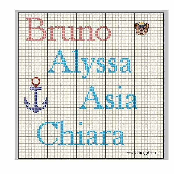 Schemi punto a croce di nomi, richiestici dai nostri utenti: Bruno, Alyssa, Asia e Chiara.