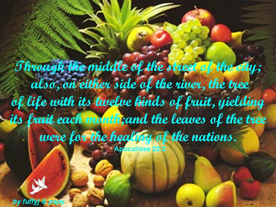 also, on either side of the river, the tree of life with its twelve hinds of fruit, yielding its fruit each month, and the leaves of the tree were for the healing of the nations.